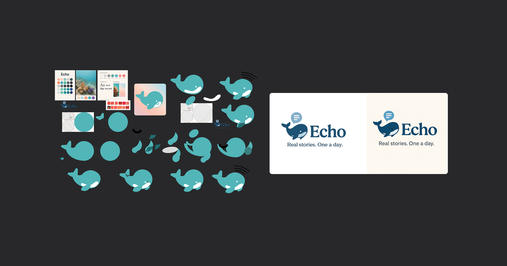 A key spark: whales pass knowledge down through generations, which led to the early concept name Echo, and a friendly whale mark (a bit like a “Twitter-simple” mascot).