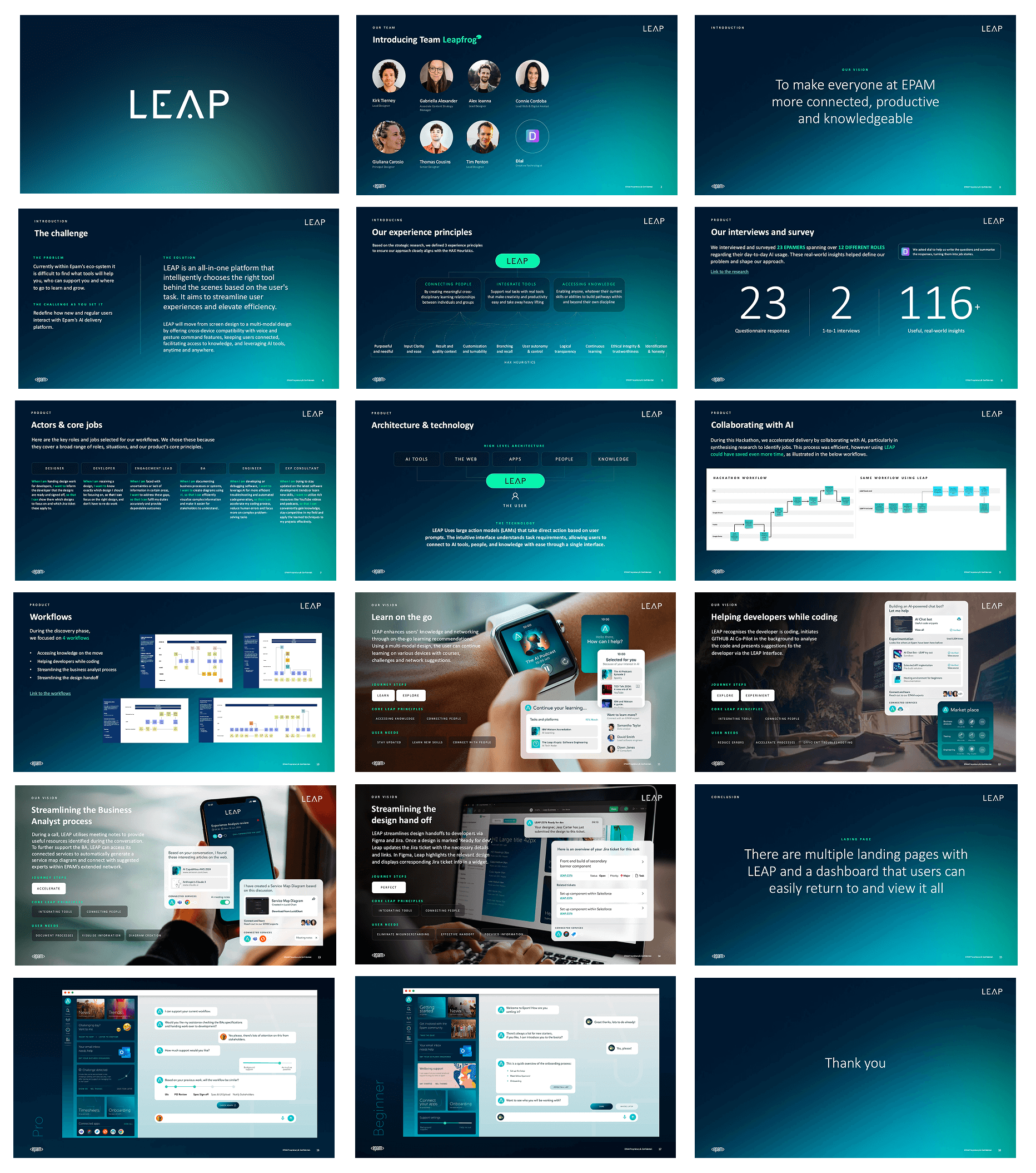 LEAP was a week-long internal hackathon at EPAM focused on exploring how AI could solve everyday challenges within the organisation — helping connect people, tools, and disciplines to improve collaboration and learning.