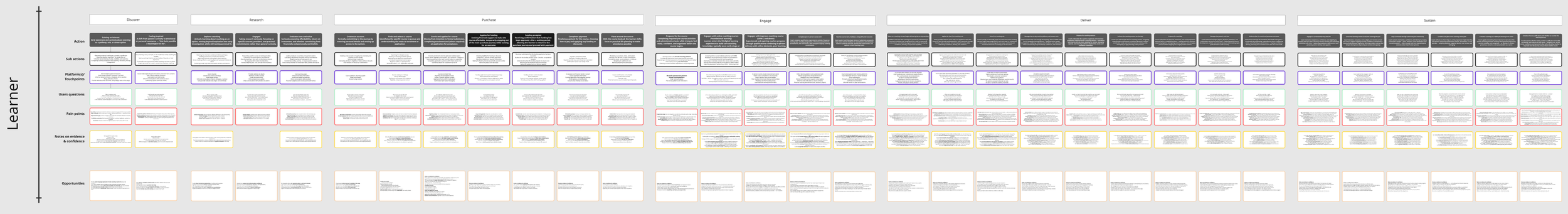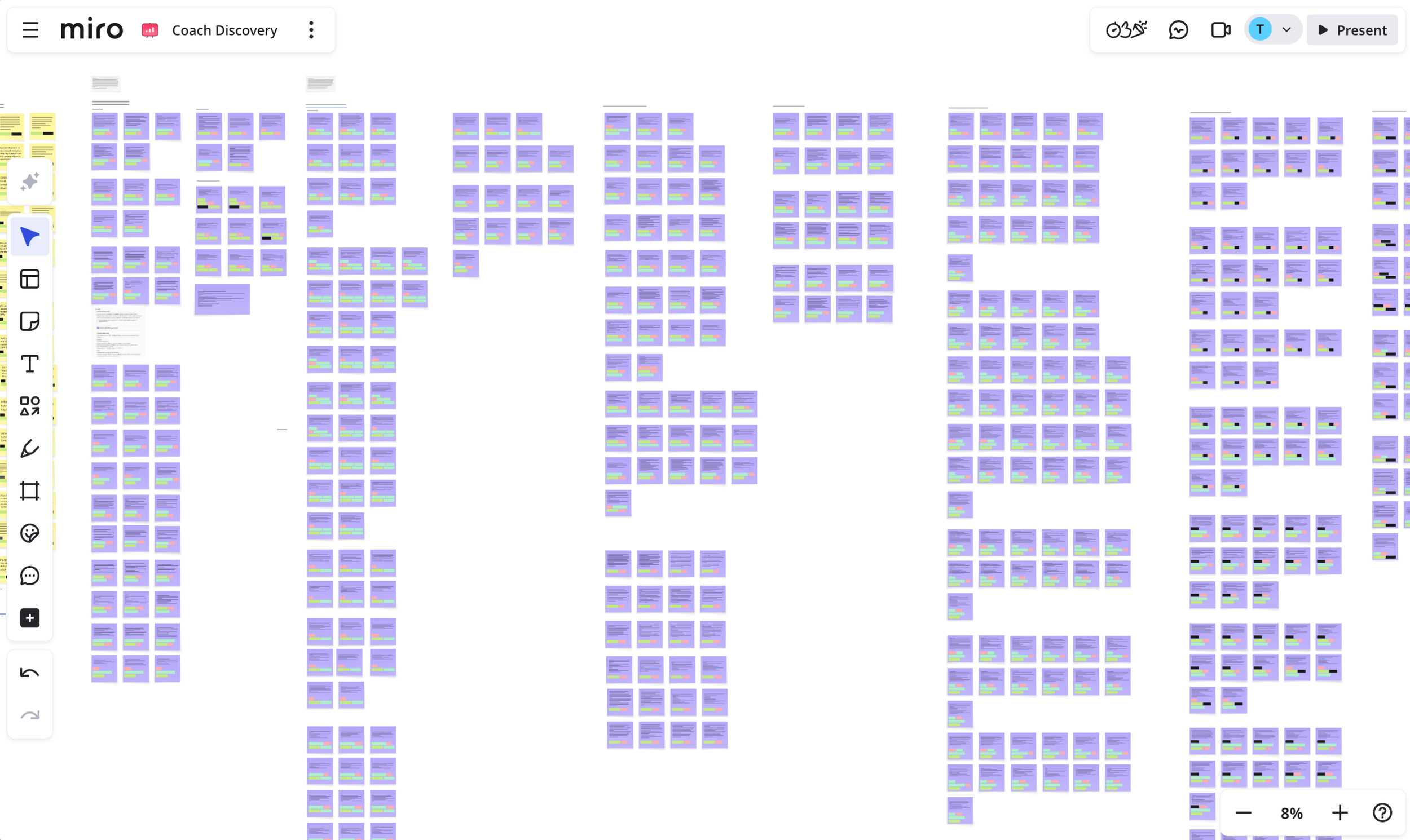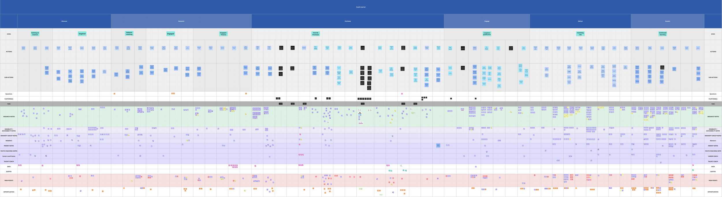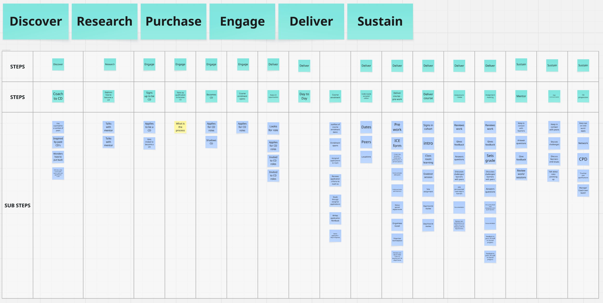 1.5 years embedded in the Lean pod, across 8 usability studies and research sessions with Coach Developers at St George's Park, meant the general flow was already internalised. That knowledge was used to map the high-level stages (discovery, purchase, and so on) along with the steps and sub-steps within them in Miro. The AI extracted the data; human expertise shaped the structure.