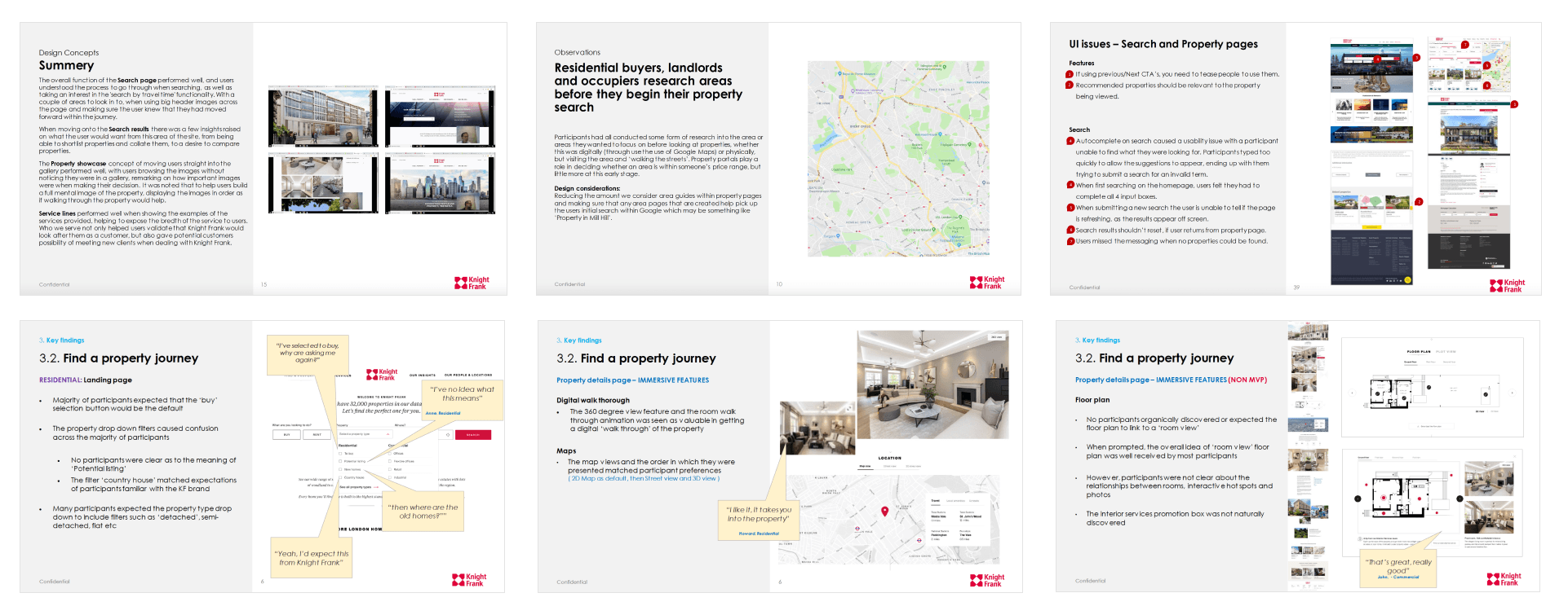 Impact: Design phase completed and signed off. The framework and patterns we built have since started appearing on Knight Frank's live website.
