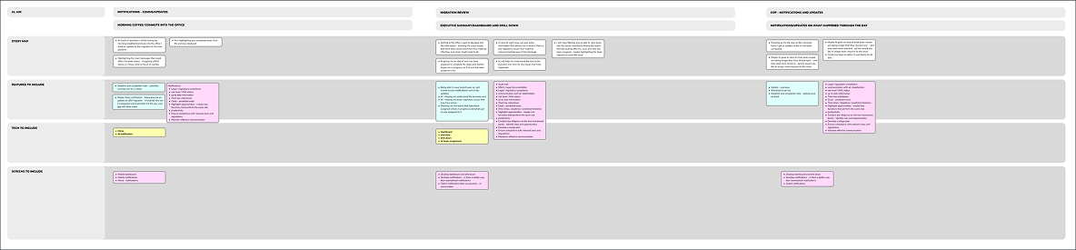 Bottom lanes: Supporting features, AI prompts, and tech considerations.